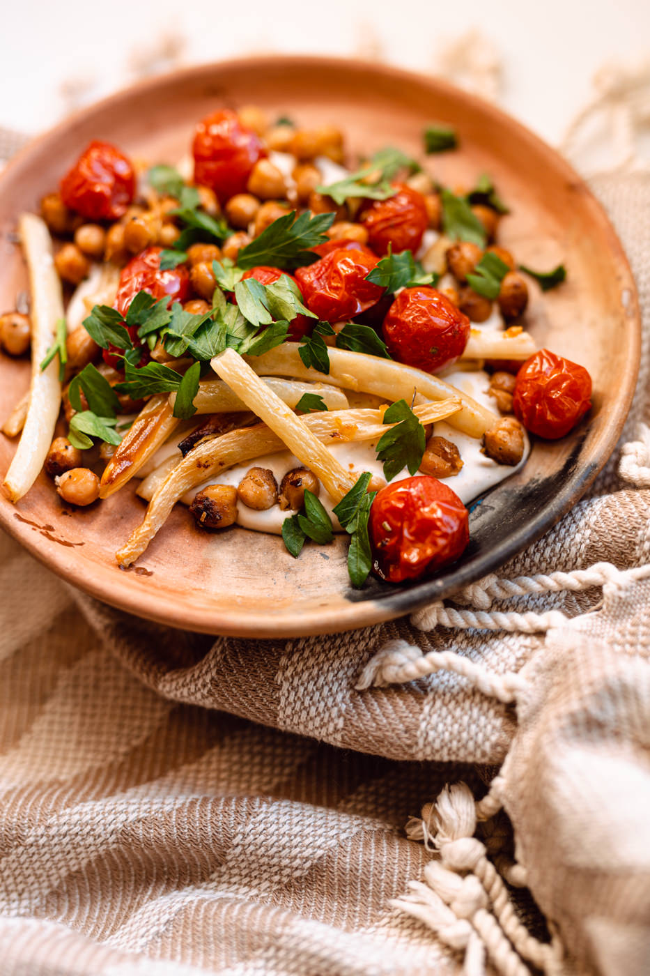 - Serwuj w głębokim talerzu lub misce. Na dnie ułóż sos, na który przekładamy upieczone warzywa. Posyp zieloną pietruszką według uznania, możesz też dodać na wierzch jajko w koszulce.